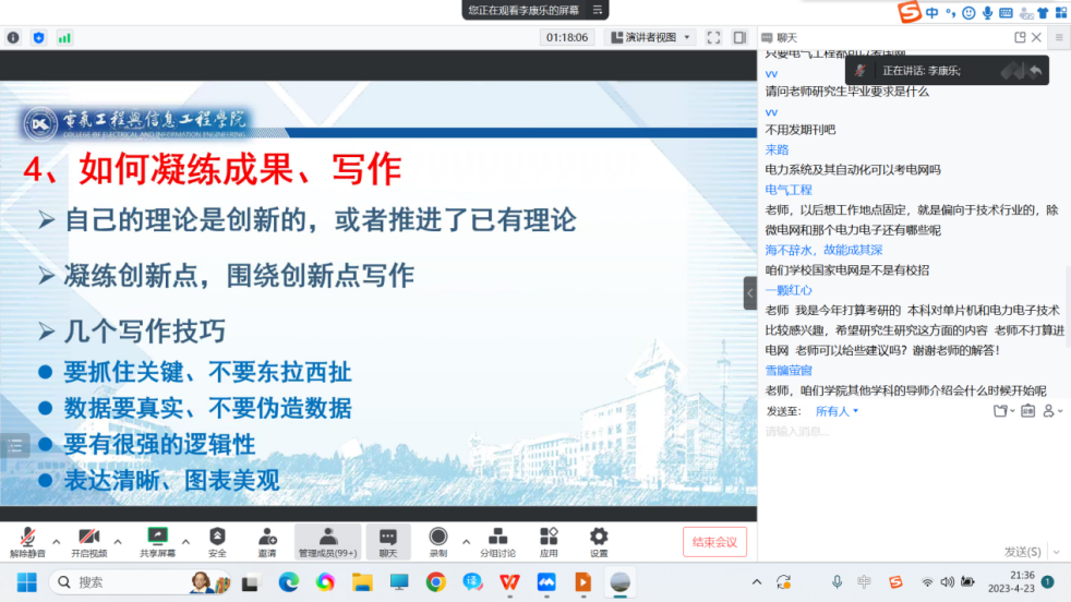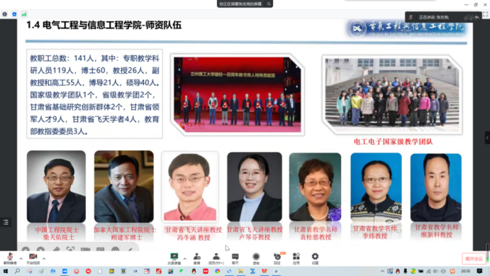 2023年4月23日晚上8.00-9.30,电气工程与信息工程学院电气工程系线上举行了2023级硕士-导师双选会。会议邀请了电气工程系2023级全体拟录取硕士、电气工程系硕士生导师、本校及外校部分大三同学。电气工程系主任张宏亮副教授首先介绍了兰州理工大学的基本情况和电信学院的发展历史,然后对电气工程学科和专业建设、师资队伍、实验室条件、创新创业、社会服务和成果转化、研究生报考和录取等情况进行了详细介绍,让拟录取研究生及大三准备考研学生全面了解了电信学院及电气工程系的教学条件、学科实力及发展情况。最后公布了电气工程系硕士生导师联系方式,动员2023级拟录取硕士和导师尽快完成预双选,以便于充分利用好读研前的这段时间,尽早投入到研究生阶段的学习准备中,为三年研究生求学生涯打好基础。