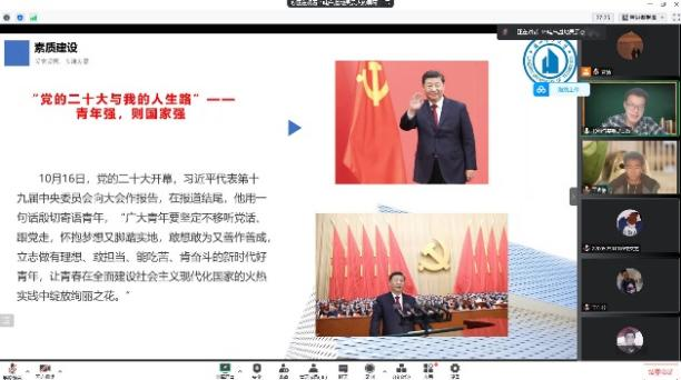 许洋同学结合党的二十大报告和自身经历,从大一到大四该如何规划,如何在保持学习成绩的同时全面发展等方面进行了分享;印宇杰同学着重从学科竞赛该怎么准备、不同年级适合参加哪些竞赛等方面进行了分享,建议同学们在生活中善于发现,不断摸索;张舜逸同学分享了党的二十大学习感悟,随后结合自身经历分享了自己的学习方法并提出了良好的学习建议。申敖凡、赵艺璇、刘迅、吴云杰、乔灏等同学也结合自己的经历从学习方法、学习建议、人生目标和阶段目标、学习资源分享等不同侧重点进行了分享。