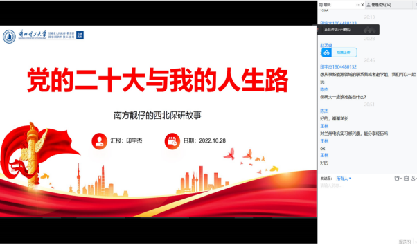 2019级电气基地班优秀保研学长结合自身经历,从学习情况、科研情况、综合实践等多方面多维度进行分享。活动开始,曾猜同学领学了党的二十大相关内容,重点学习了党的二十大报告中的“关键词”和报告中习近平总书记殷切寄语青年的一段话,引导低年级同学从党的二十大报告中汲取营养,确定自我定位与目标,合理规划自己的大学生活,减少迷茫和困惑。