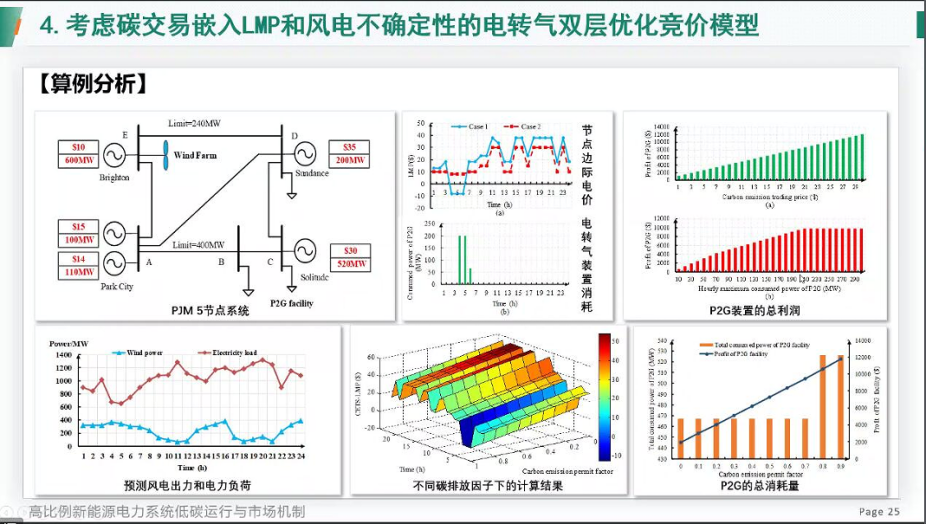 姜教授首先以当前实现“碳达峰、碳中和”和构建以新能源为主体的新型电力系统国家战略目标为切入点,阐述了高比例新能源电力系统低碳运行的机遇与挑战。其次,从考虑需求响应和碳捕捉的随机优化、风储系统与碳捕集电厂的联合鲁棒优化、考虑碳捕集电厂和碳交易机制的电力系统分散式经济调度等方面分析了高比例新能源电力系统低碳运行策略。最后,从考虑碳交易嵌入LMP和风电不确定性电转气双层优化竞价模型、考虑碳排放影响的综合能源系统最优能量流与节点能价两个方面,阐述了新型电力系统低碳运行市场机制。