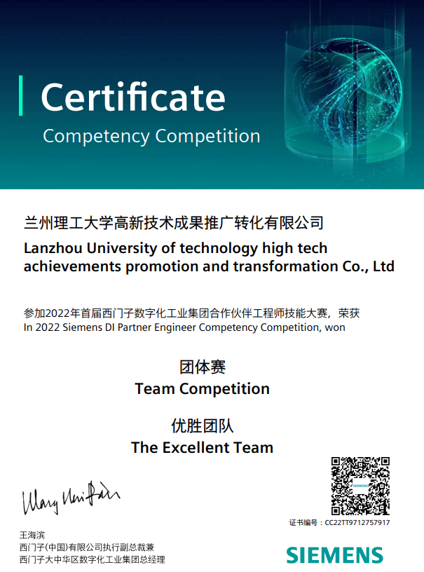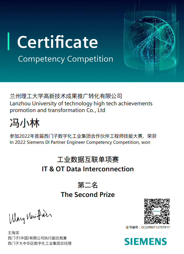 在近日结束的2022西门子数字化工业集团-合作伙伴工程师技能大赛中,由电信学院三位教师吴延明、刘朝荣和冯小林代表兰州理工大学高新技术成果推广转化有限公司(西门子数字化工业集团授权的系统集成商)参赛,吴延明、刘朝荣和冯小林在西部赛区突出重围,代表西部地区参加了全国总决赛。在全国总决赛中冯小林老师在“工业数据互联”个人赛中获得全国第二名,由吴延明、刘朝荣和冯小林组成的代表队进入团体赛决赛12强,获得优胜团队奖。