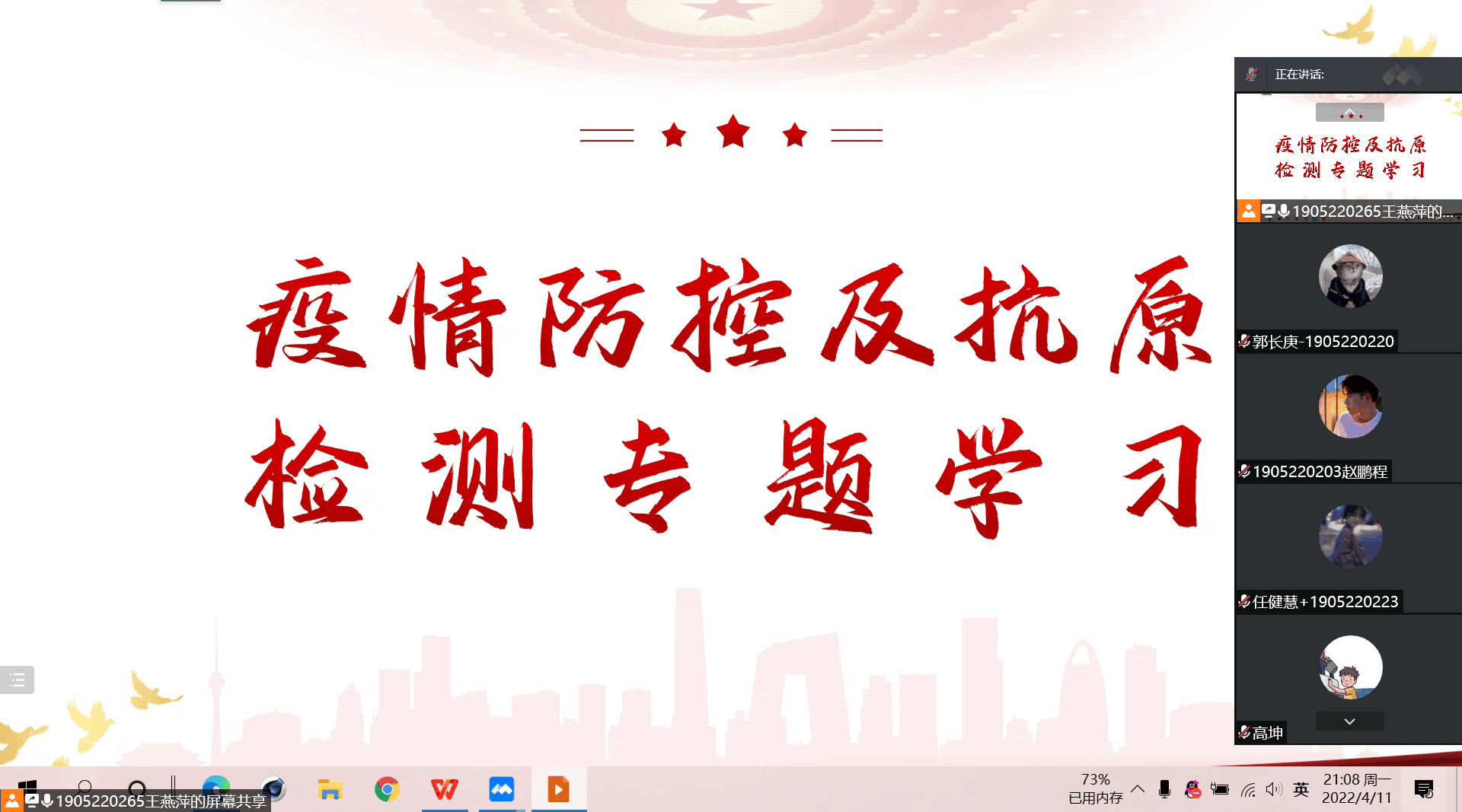 本次疫情防控及抗原检测专题学习线上班会、团日活动做到了全员参与,人人学习,不仅再次对学院全体学生进行了生命教育、责任教育、规则教育、习惯养成教育,更增强了大家的防疫能力,树立了防疫信心,形成了防疫合力,号召广大学生以更坚定的信心,筑牢校园的安全防线,为落实学校、学院的疫情防控工作贡献自己的一份力量。(撰稿:王洁;终审:王玲)