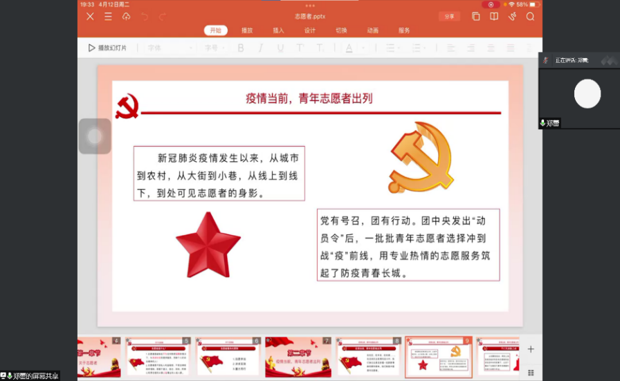 在抗击疫情这场没有硝烟的战争中,有人赴前线,有人守后方,在每一个岗位上都出现了很多平凡英雄,每天都发生着平凡而又不平凡的故事,4月12日,电信学院组织开展“我身边的抗疫人”主题分享会,让同学们一起走进抗疫者,来聆听他们的故事,从中感受他们的抗疫力量!