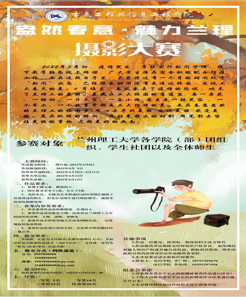 本次“盎然春意,魅力兰理”校园春景大赛由电信学院主办,面向全校师生开展,分为教师组和学生组两个赛道,且活动形式新颖,持续时间较长,从4月3日—4月8日为作品征集时间,各位参赛选手可以走在春意盎然的校园里,用心去寻找工大春天的美丽,且参赛作品题材不限但需积极健康、乐观向上,贴近主题,同时本次大赛共设置一等奖5名,二等奖10名,三等奖15名,优秀奖20名,获奖名额多且奖品丰厚。