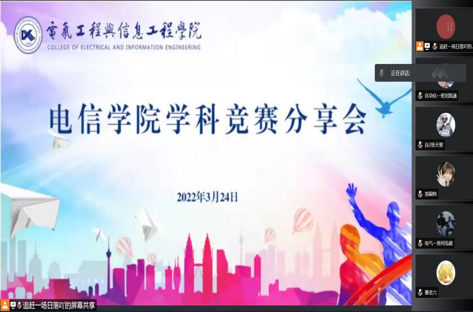 3月24—25日,学院19级、20级励志奖学金、国家奖学金获得者,学科竞赛先进学生等优秀学生代表为20级、21级的同学们就学科竞赛内容、参赛方法、参赛资料等进行了线上分享。在分享会上,各位优秀、先进学生结合自己的实际经历,就教育部学科竞赛排行榜内相关比赛的报名方式、比赛内容、实践操作等方面一一为同学们进行了详细的介绍,其中19级电气基地班印宇杰同学从比赛心态、参赛计划、赛后总结三个方面为大家进行分享,“首先,我要说的是“心态”,可以说好的心态是在比赛时取得优异成绩必不可少的要素,没有好的心态就难以在比赛时发挥出真实的水平。其次是赛后总结,在参加比赛时,大家应该进行思考,要找到比赛之间的相似性、相关性,对比找到不同性,这样才能提高效率。”20级自动化3班杨泷瑞同学分享了自己参加互联网+、挑战杯、智能车比赛的经历“在参加比赛之前,大家要制定自己的目标,有目标就有动力,不要畏惧。我认为不错的参加比赛的方法是赛前最好做好准备,如果实在是没有相关参赛经历就应该多学多看多问,跟着老师的思路走,多向高年级的学长们请教一下,这样你会节省很多的时间,不然你可能得花成倍的时间去弄懂比赛内容及要求。”