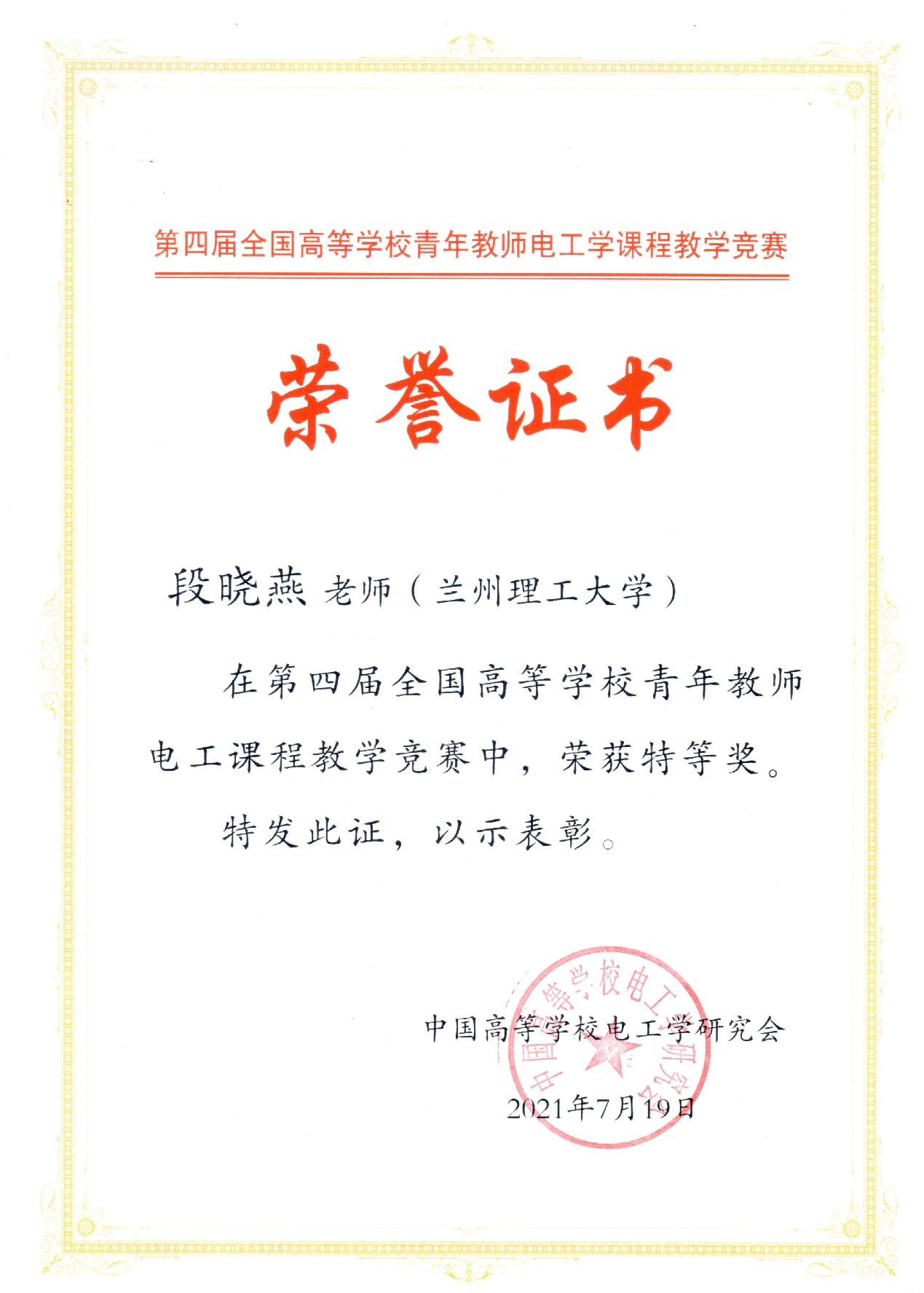 2021年7月19日,我校电信学院段晓燕老师作为甘肃省青年教师电工学课程教学竞赛特等奖获得者,代表甘肃省参加了第四届全国高等学校青年教师电工学课程教学竞赛决赛。决赛在中国矿业大学举行,来自全国29个省市的58名教师参加了此次大赛。经过三天的激烈角逐,段晓燕老师摘得桂冠,荣获全国高等学校青年教师电工学课程教学竞赛特等奖,实现了我省特等奖零的突破。
