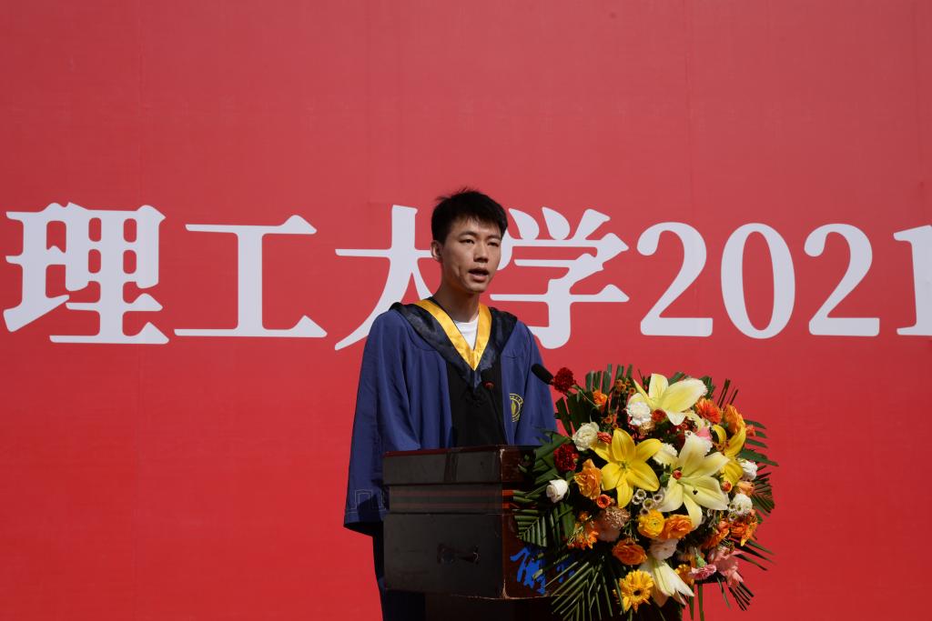 典礼上,2021届硕士毕业生代表牟淼、2021届本科毕业生代表赵石磊同学代表全体毕业生做了发言,表达了对全体毕业生在困惑时点亮指明灯,失败时给予勇气的老师、父母、朋友的由衷感谢和离别之情。号召全体毕业生绝不辜负母校和老师的辛勤培育,在“天高任鸟飞,海阔凭鱼跃”的时代大潮中,走好新长征路,书写属于2021届毕业生的锦绣华章。2018级高语阳同学代表全体在校学生对2021届毕业生表达了感谢并送上了毕业祝福,祝愿所有2021届毕业生用激情唱响青春的动人乐章,用才华绽放出人生的绚烂花朵,前程似锦,归来仍是少年。