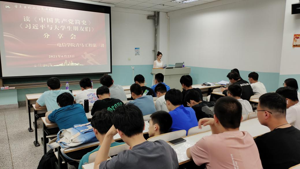 6月 23日晚,电信学院第三期“青马工程”培训班在彭家坪校区励志楼开展读书分享会,青马班学员齐聚一堂,共同分享读书心得。分享会上,各读书组采用不同形式分享了他们精心挑选的书籍,包括《中国共产党简史》《习近平与大学生朋友们》等书目。大家从不同角度用生动的事例、形象的言语畅谈读书体会,分享读书感悟,言语中洋溢着顿悟、启迪后的喜悦。整个分享会内容丰富、氛围浓烈、充满活力,引起了在场每位青年的共鸣,博得阵阵掌声。从中国共产党的百年奋斗历程中,从总书记对大学生的殷殷期盼中,青马学员们汲取了坚定信念的精神力量,切实领会到了我们党的一百年是矢志践行初心使命的一百年,是筚路蓝缕奠基立业的一百年,是创造辉煌开辟未来的一百年。
