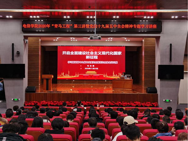 11月23日晚,电信学院2020年“青马工程”第三讲暨党的十九届五中全会精神专题学习讲座由兰州理工大学马克思主义学院马云霞副教授在图书馆106报告厅开讲。