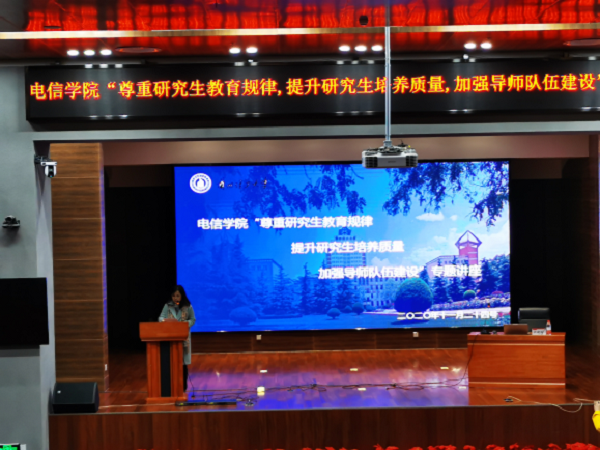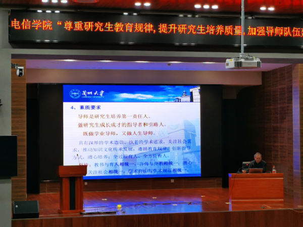 为深入贯彻落实习近平总书记就研究生导师培养的重要指示,全面贯彻全国教育大会、全国研究生教育会议精神,加强研究生导师队伍建设,规范研究生导师指导行为,全面落实研究生导师立德树人职责,2020年11月24日下午,电信学院举办“尊重研究生教育规律、提升研究生培养质量、加强导师队伍建设”专题讲座报告会,邀请兰州大学研究生院学位管理办公室主任武建军教授做《加强研究生教育质量意识 提高立德树人能力》报告。