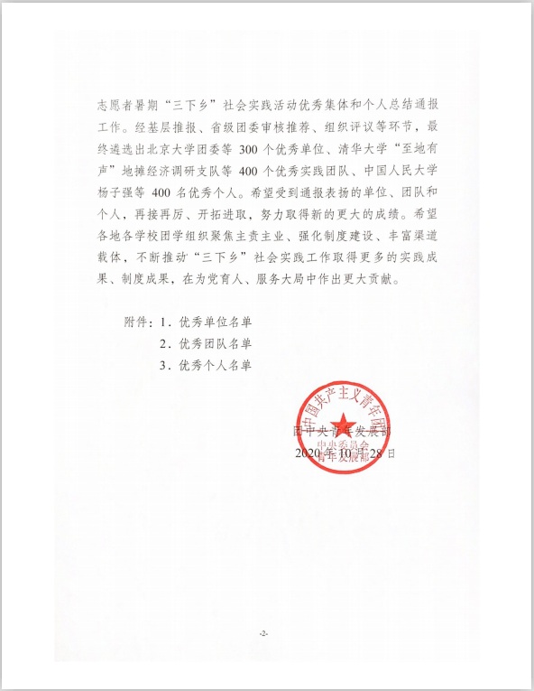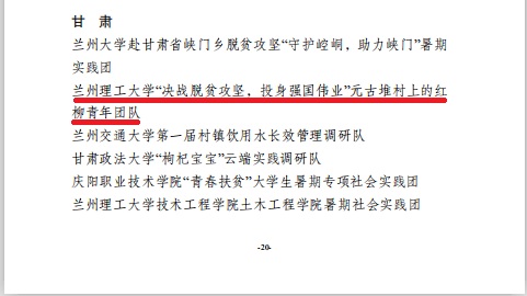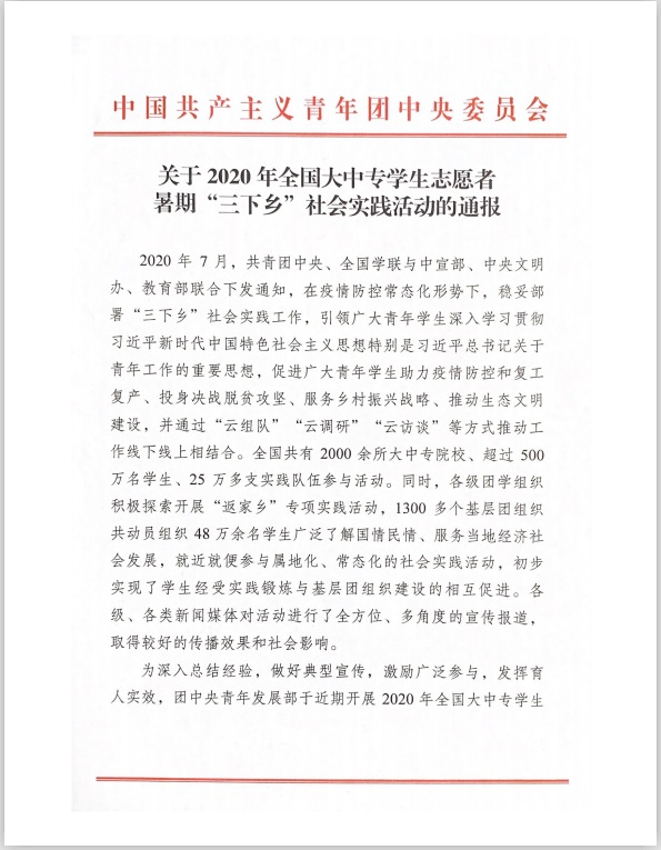 近日,团中央青年发展部公布了2020年全国大中专学生志愿者暑期“三下乡”社会实践活动总结通报,电信学院“决战脱贫攻坚,投身强国伟业”元古堆村上红柳青年团队获“优秀团队”表彰。