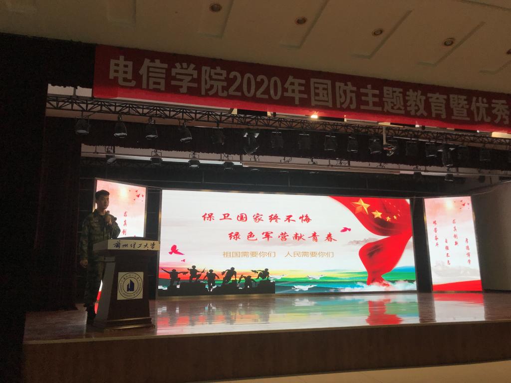 11月12日晚,电信学院于彭家坪校区大学生活动中心顺利举办2020年国防主题教育暨优秀退伍大学生事迹宣讲会。学校学生学业发展指导与国防教育中心唐洪川主任,学院优秀退伍大学生代表达选财、李林、刘泽润、何小强、张玉祥等五名同学,学院辅导员李婷、成晨老师以及各年级学生代表共300余人参加活动。