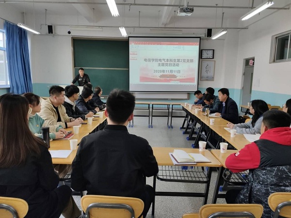 2020年11月11日,电信学院电气本科生第2党支部于励志楼B204教室召开“学习十九届五中全会精神,争做新时代优秀党员”主题党日活动。学校党委常委、组织部部长王佰成同志,电信学院党委副书记朱毓杰同志和电气本科生第2党支部全体党员参加活动。