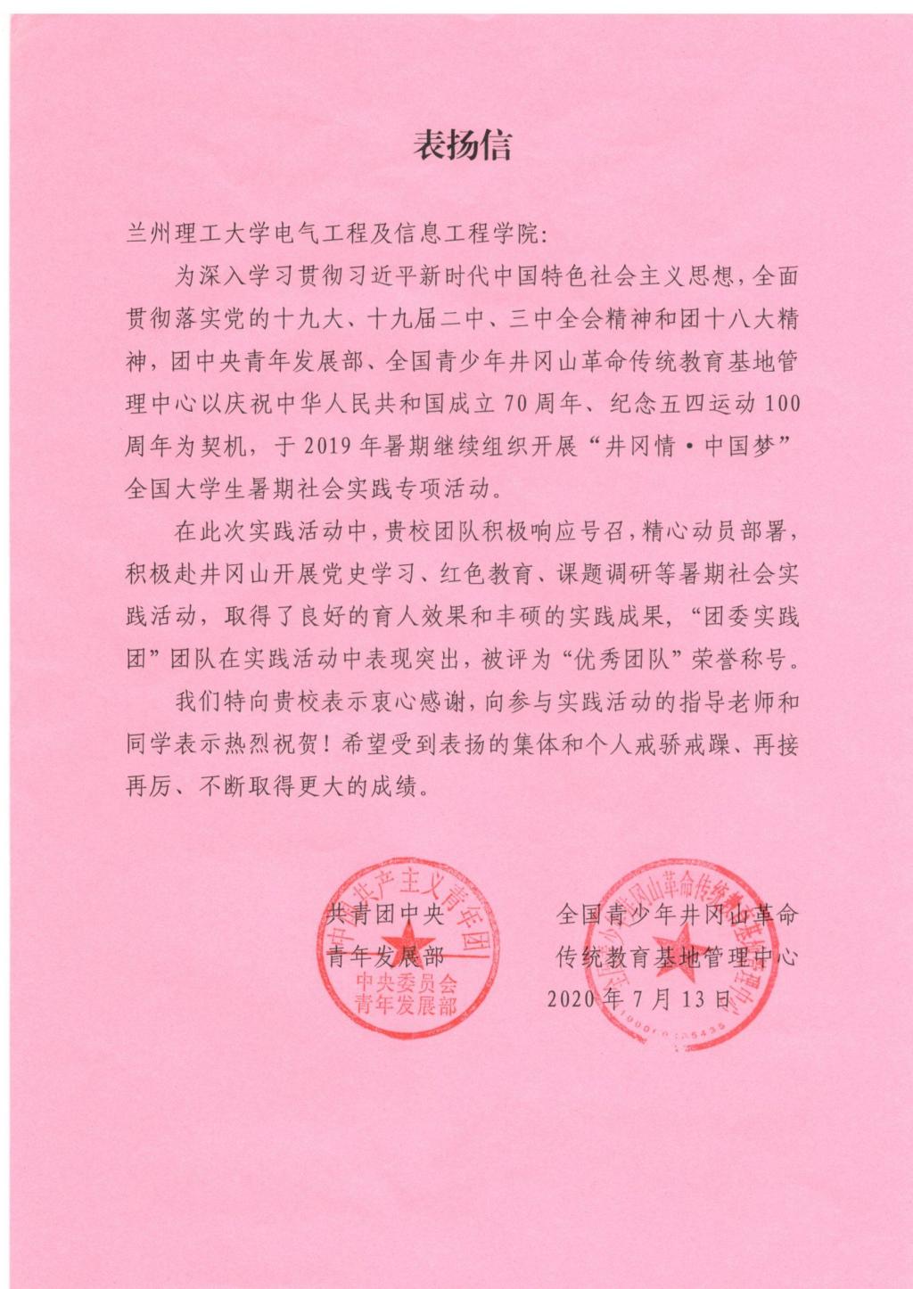 近日,共青团中央青年发展部、全国青少年井冈山革命传统教育基地向兰州理工大学电信学院发来信函,表扬学院在2019年“井冈情·中国梦”全国大学生暑期社会实践专项活动的突出表现。