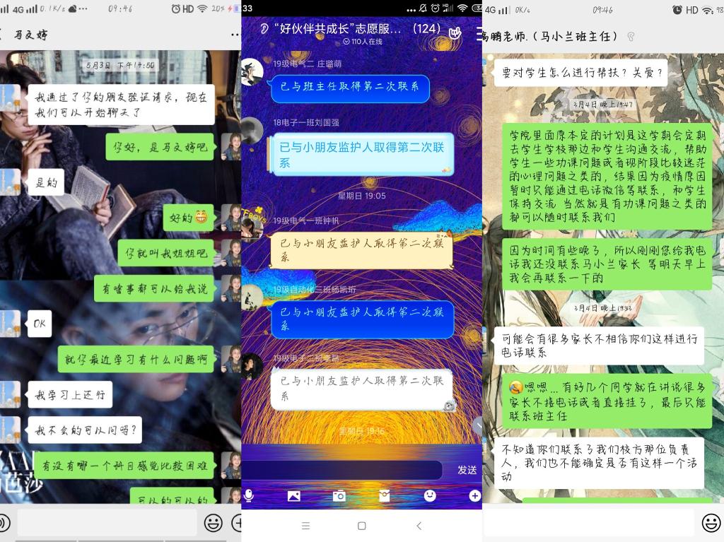 截止目前,学院组织志愿者通过电话、QQ等方式与留守儿童先后联系两次。第一次联系过程中,志愿者们碰到了诸如对接孩童联系方式有误、家里人拒接电话、语言沟通不便等困难。志愿者们通过学生老师、当地村干部等想方设法联系到自己的志愿服务对象,向孩子们讲解介绍了防疫常识与注意事项,并增进了解便于后续工作。5月初,学院集中组织志愿者进行第二次联系,了解近期关爱对象的学习、生活及心理状态,结合孩子的实际情况,帮助其落实学习成长规划、心理疏导、兴趣培养等,使留守儿童在疫情期间也会感受到悉心的关心与照顾。