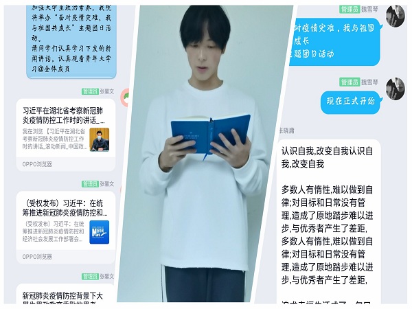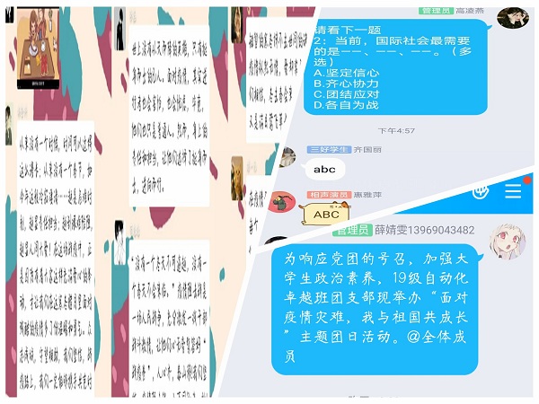 各团支部采用视频展播、问题思考、事迹分享、互动讨论等多种形式。《英雄之城》、《生死金银潭》等一部部抗“疫”群英谱,让青年学生知道有勇敢拉响警报的人、有与死神争分夺秒的人、有各地星夜赶路驰援的人,平凡的人造就不凡的诗篇。在本次疫情防控工作中,各支部都涌现出防控志愿者的身影,由此活动中事迹分享环节,志愿者们结合自身实际分享居家学习期间的所思所想及参加现居住地疫情防控工作的个人事迹。互动讨论中,同学们表达了有对战疫期间中国特色社会主义制度凸显出优越性的深情讴歌,有对舍小家为大家驰援武汉医护人员的高度敬意,还有作为青年人立志艰苦奋斗与祖国共成长的坚定决心等。