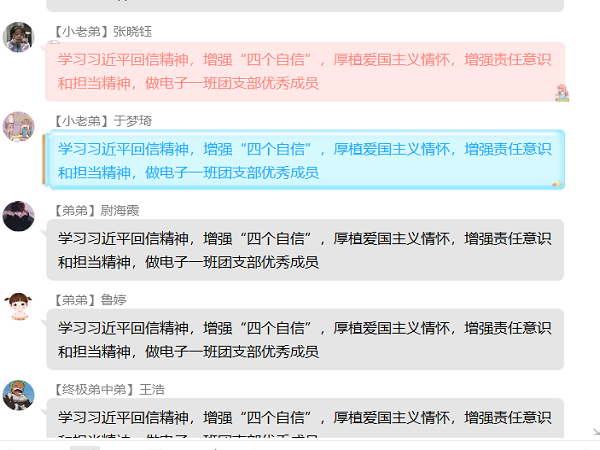 在此次学习《回信》过程中,大家学精神、谈感想、抒体会,充满了对中国特色社会主义制度的自信与自豪。各支部围绕习近平总书记“广大青年用行动证明,新时代的中国青年是好样的,是堪当大任的!”等重要内容,谈自己在习近平总书记回信中所领会到的精神,谈本次疫情中当代青年的作用,并纷纷表示要牢记总书记嘱托,以抗击疫情的白衣天使为榜样,发挥团员的先锋模范带头作用,以北京大学援鄂医疗队全体90后党员为榜样,激励有理想、有本领、有担当的电信学子在今后不忘初心,奋发有为,努力为祖国发展、民族复兴贡献自己的力量。