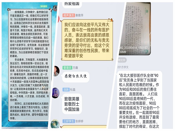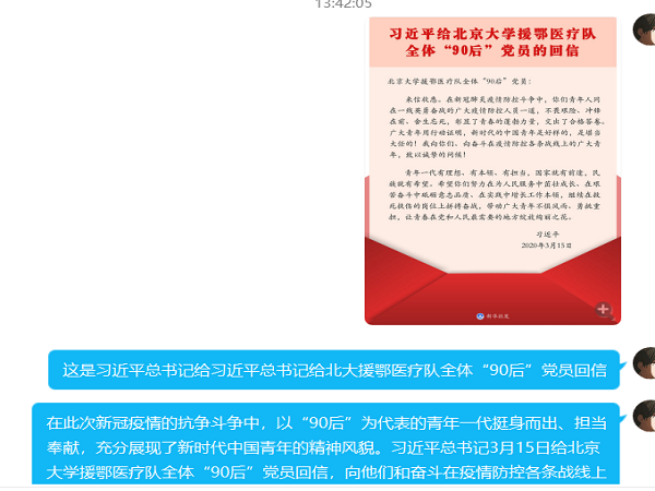 在校团委的号召和部署下,2020年4月10日,电信学院组织学院各团支部线上学习《习近平总书记给北京大学援鄂医疗队全体90后党员重要回信》精神,把制度自信的种子播撒进青年学生的心灵。学院各基层团支部共组织两千余名团员青年参与学习和讨论。