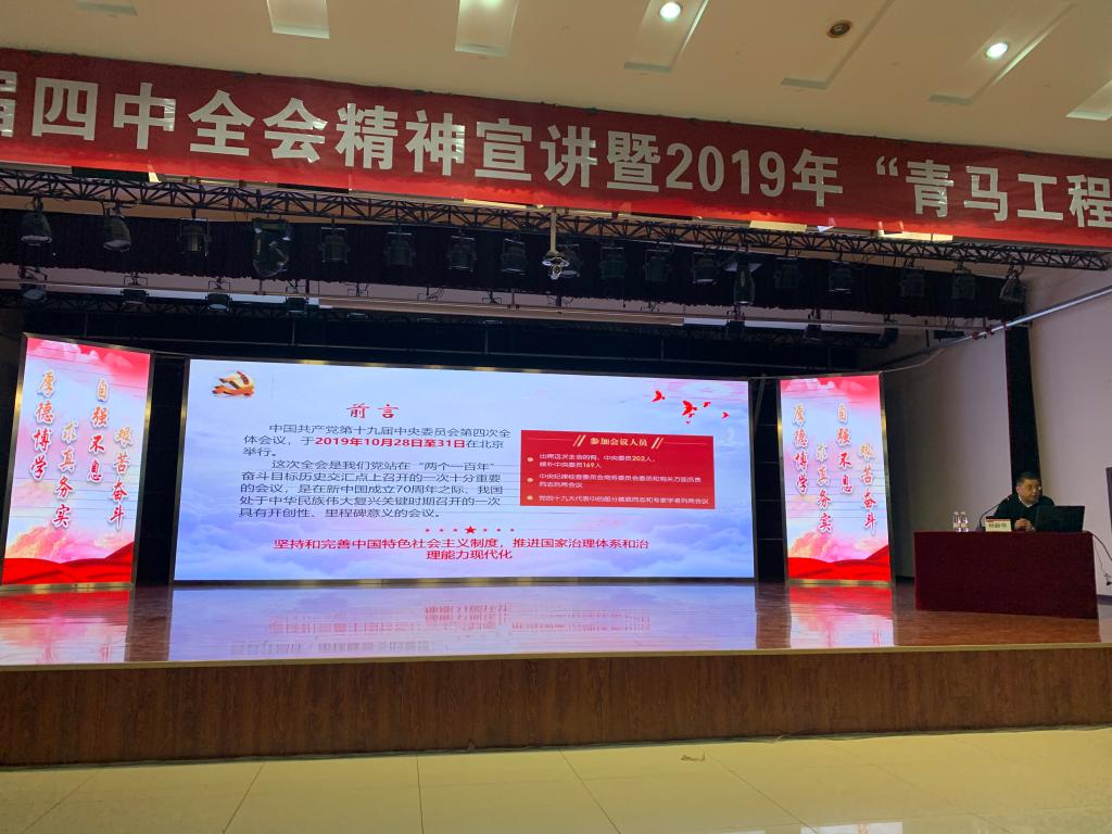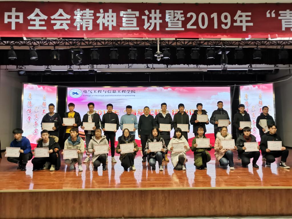 2019年12月10日晚,电气工程与信息工程学院于彭家坪校区大学生活动中心举办十九届四中全会精神宣传暨2019年“青马工程”结业仪式。学院党委书记杨新华、副书记朱毓杰、各年级辅导员以及学院2019 年“青马工程”培训班全体学员、2019 级学生代表共四百余人参加了本次活动。会议由2018级辅导员李婷老师主持。
