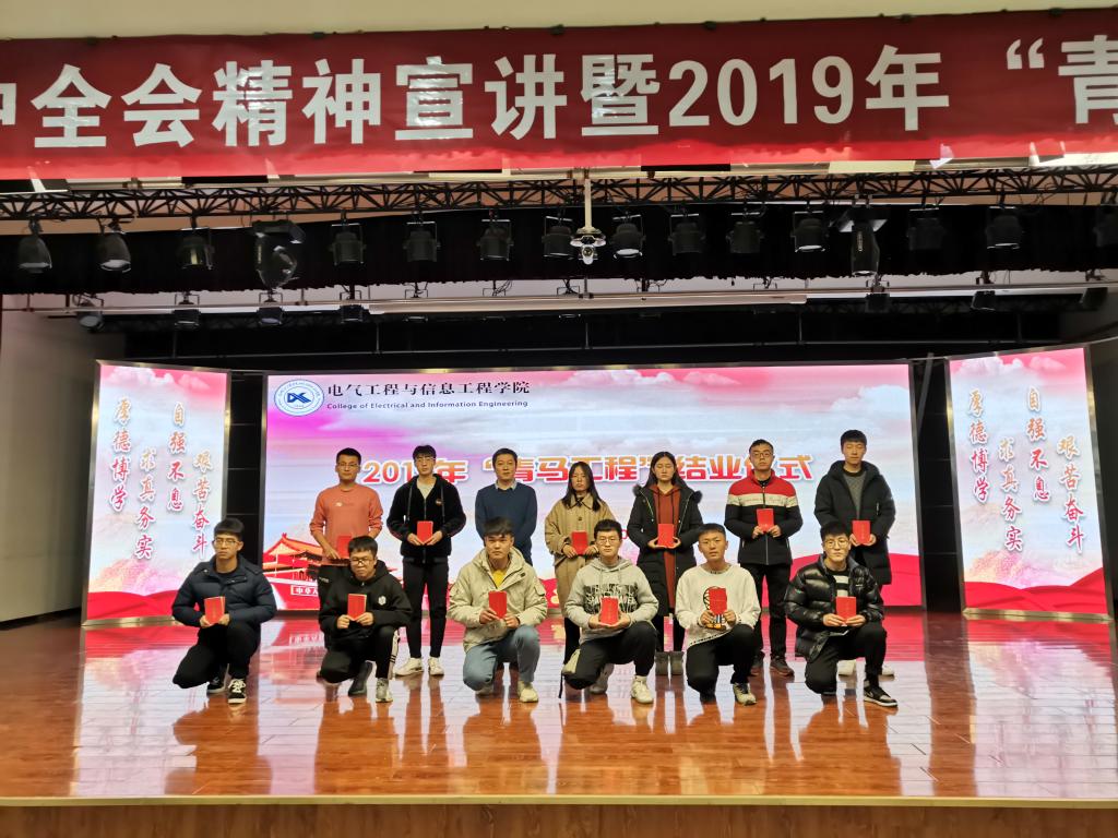 活动在全场师生高唱国歌声中拉开帷幕。首先通过微视频的方式,回顾了学院2019年“青马工程”工作情况,学院团委书记班振海老师通报了2019年“青马工程”培训班情况并宣读了优秀学员名单。学院党委副书记朱毓杰为2019年“青马工程”结业学员代表颁发结业证书,党委书记杨新华为优秀学员颁发了荣誉证书。 2019级自动化卓越班王浩宇同学代表全体学员上台发言,分享了自己参加“青马工程”培训的感悟和收获,向辛勤授课的老师和学院的精心组织表示了感谢,他表示“青马培训给我们每个人一份青马的情结,在青马培训中所学到的必将会使我们受益终生”,并号召广大青年学生努力学好专业知识,力争打下扎实基础;自觉引领时代发展的新风;在实践中不断增强创新的本领。