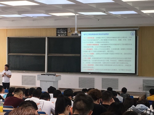 电气工程系教师张宏亮在向毕业生介绍电气工程及其自动化专业的毕业要求