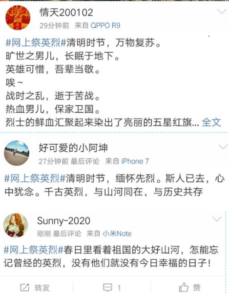 2日至4日,学院通过双微平台发起了网上寄语活动,同学们纷纷留下了自己对逝去英烈的寄语。通过线上寄语留言的形式,积极发动学院团员青年学生参与讨论,更好的让广大同学铭记历史,缅怀先烈,传承民族精神,激发奋斗力量。 |