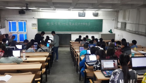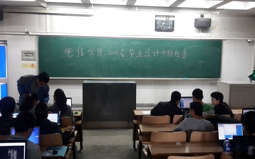 为了加强毕业设计(论文)的过程管理及质量监控,保障毕业设计(论文)质量,了解学生毕业设计(论文)进度以及教师指导情况,电信学院于2016年5月24号上午8点30,在1南303对2016届本科毕业设计(论文)进行了全面、认真、细致的中期检查。 本次检查以抽查方式进行,抽选了学院学号尾数为1的学生进行了检查。学院从各专业基层组织抽调了系主任、教学骨干、以及教学副院长共7名教师对学生进行了检查。本次毕业设计(论文)中期检查主要包括指导教师指导情况(任务书、中期检查自查表)和毕业设计(论文)进展(文献综述、外文翻译、参考文献等 )。 毕业设计(论文)是高校人才培养质量的重要评价指标。通过本次中期检查,对毕业设计(论文)进行全面、细致的过程评价,及时发现毕业设计(论文)中间环节存在的问题和不足,与毕业设计(论文)选题、毕业设计(论文)答辩共同构成毕业设计环节质量监控的全过程管理,形成“结果与过程评价结合”的评价体系,促进毕业设计(论文)质量的提升。