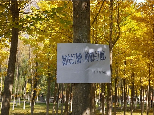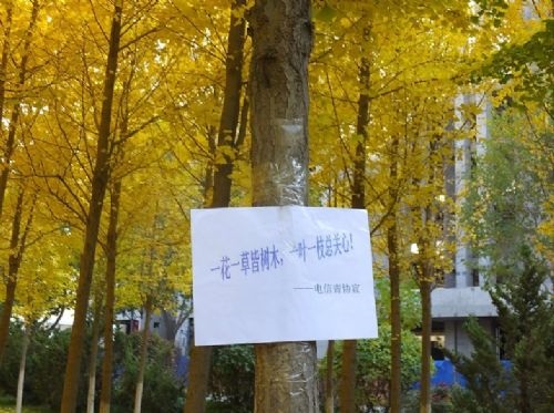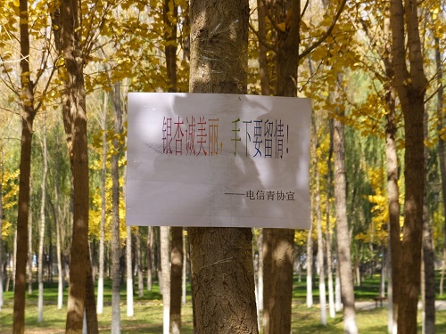 10月16日上午,电信学院青年志愿者协会,穿着天蓝色的服装,在西校区银杏林开展“保护银杏林,我们在行动”志愿服务活动。 金城十月,工大银杏林焕发了迷人的色彩,同学们在欣赏美景的同时也带来了许多不文明现象。志愿者们拣除银杏林内各类垃圾,引导同学们文明观赏,经过努力,美丽的黄金走廊再次呈现在人们眼前。志愿者们还制作了许多温馨提示卡,呼吁大家建设“美丽工大”,希望在全校师生的共同努力下,银杏林成为工大校园“最美丽的一道风景”。 |