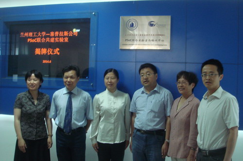 揭牌仪式由电信学院李策副院长主持。张爱华院长代表学院致欢迎词,并简单介绍了电工电子国家级教学团队的建设情况,以及省级实验教学示范中心电工电子实验教学中心的管理、教学情况和本次建成的西北最大规模的片上可编程实验室的情况,并希望Cypress不断为该实验室提供先进的技术支持,相信随着双方合作的进一步深入,一定会对学校的人才培养起到很大的推进作用。Cypress大学计划徐平波顾问,介绍了Cypress半导体公司的情况,PSoC技术的优势及其应用领域,希望将PSoC联合实验室作为学生技术培训、教师科研的平台,将世界最前沿的技术带给学生,并且能够得到广泛运用。杨新华书记和Cypress大学计划经理魏荣博士为“PSoC联合实验室与培训中心”共同揭牌。