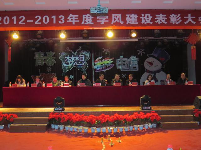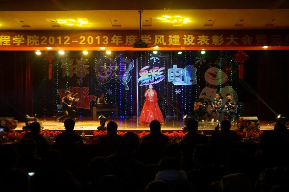 晚七点,2012-2013年度学风建设表彰大会准时开始。大会表彰了在过去一年里表现优异的先进个人与集体,并颁发了证书与奖金。李战明教授对他们表示热烈祝贺,希望受到表彰的同学们能够为广大同学做好榜样,为我校的学风建设出一份自己的力。随后,在动感的歌伴舞《酒醉的探戈》中,晚会拉开了序幕。晚会以“青春梦想·多彩电信”为主题,激情洋溢的歌曲串烧,时尚绚丽的街舞表演,幽默诙谐的小品节目,可谓是精彩纷呈,各显身手。更有老师带来独唱《我爱你中国》,赢得了师生此起彼伏的阵阵掌声。整场晚会气势恢宏、精彩纷呈,高潮迭起,掌声此起彼伏,气氛也是活跃热烈。最后,晚会在大合唱《我相信》中圆满谢幕。