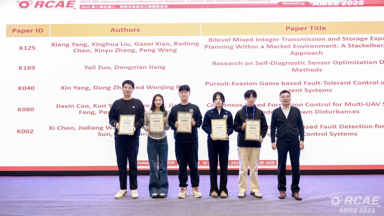 2025年10月24日至26日,自动化学院师生前往西安,参加第八届机器人、控制与自动化工程(RCAE2025)国际会议,会议由IEEE、IEEE Robotics & Automation和西安工业大学主办,西安交通大学、西北工业大学、西安电子科技大学、长安大学等联合承办。会议采用线下线上融合模式,吸引全球500余位专家学者、工程技术人员及研究生代表参会,为控制领域的各位学者,提供了一个关于机器人控制与自动化工程最新进展的交流与传播平台。
