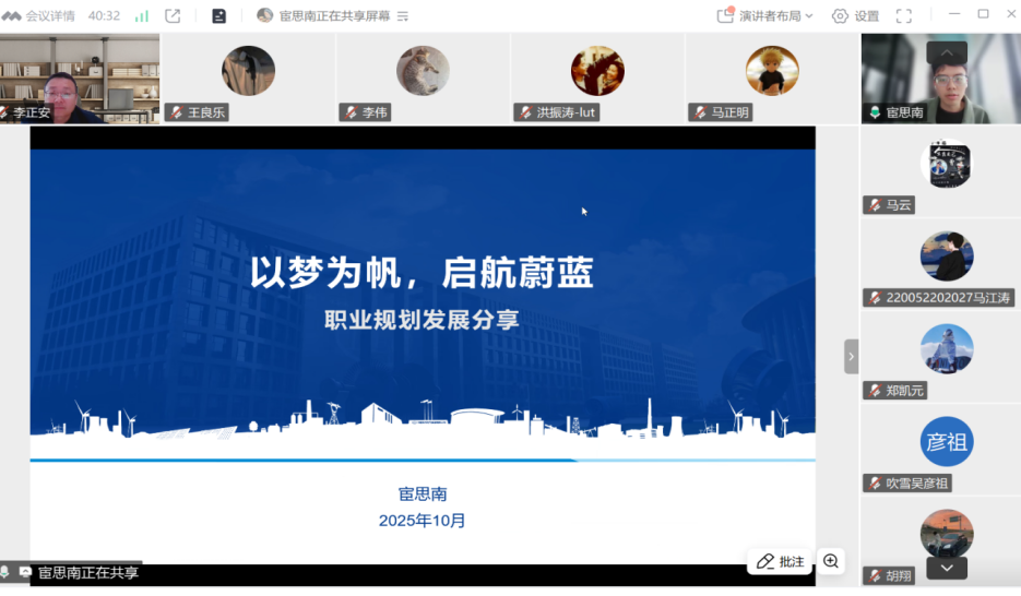 宦思南以“以梦为帆,启航蔚蓝”为主题,围绕“我的大学生活”“职场现状”“经验感悟”“互动交流”四个板块展开专题分享,并在线为同学们答疑解惑。