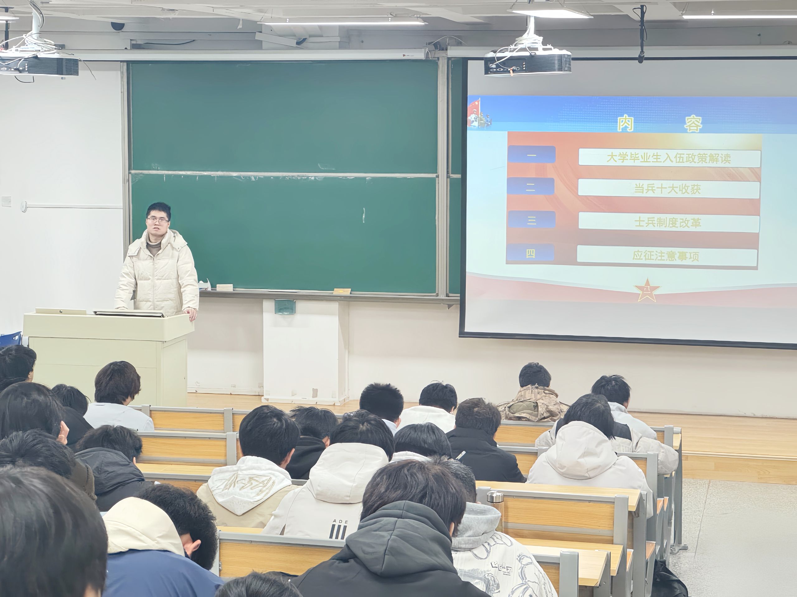 为积极响应国家号召,扎实推进国防教育与征兵动员工作,12月24日晚,自动化学院面向2025级新生举办征兵宣传动员暨“最美退役大学生”先进事迹报告会。通过退役学子真实生动的军旅讲述和政策解读,引导广大青年学子立报国之志、践强军之行。