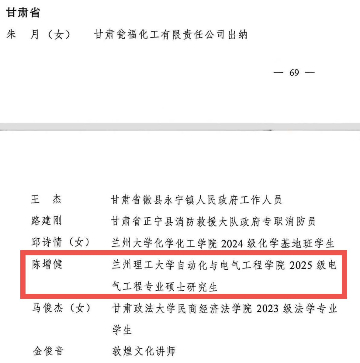 陈增健:他积极参与思想政治学习与红色教育活动,曾担任学校校史馆志愿讲解员并完成50余场讲解。他先后获评邯郸市“向上向善好青年”、河北省“优秀共青团员”等荣誉。他打造“青春向党・多彩校园”品牌活动,带领团队获共青团中央“镜头中的三下乡”优秀摄影团队称号;组织“志愿服务月”活动,带领团员深入社区、敬老院服务,累计服务时长超600小时。他曾冒雪等候失主两小时,归还内含7000余元现金的钱包并婉拒酬谢,获评“拾金不昧显品德,新时代好少年”。