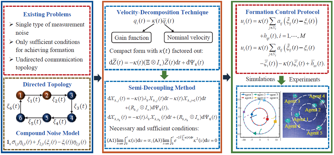 “Formation Control of Stochastic Heterogeneous Multi-Agent Systems: Necessary and Sufficient Conditions”,首次针对同时受复合噪声干扰、具有有向通信拓扑的随机异构多智能体系统,提出了一个创新的分布式编队控制协议,并严格推导出系统实现精确编队的充分必要条件,填补了该领域的理论空白。
